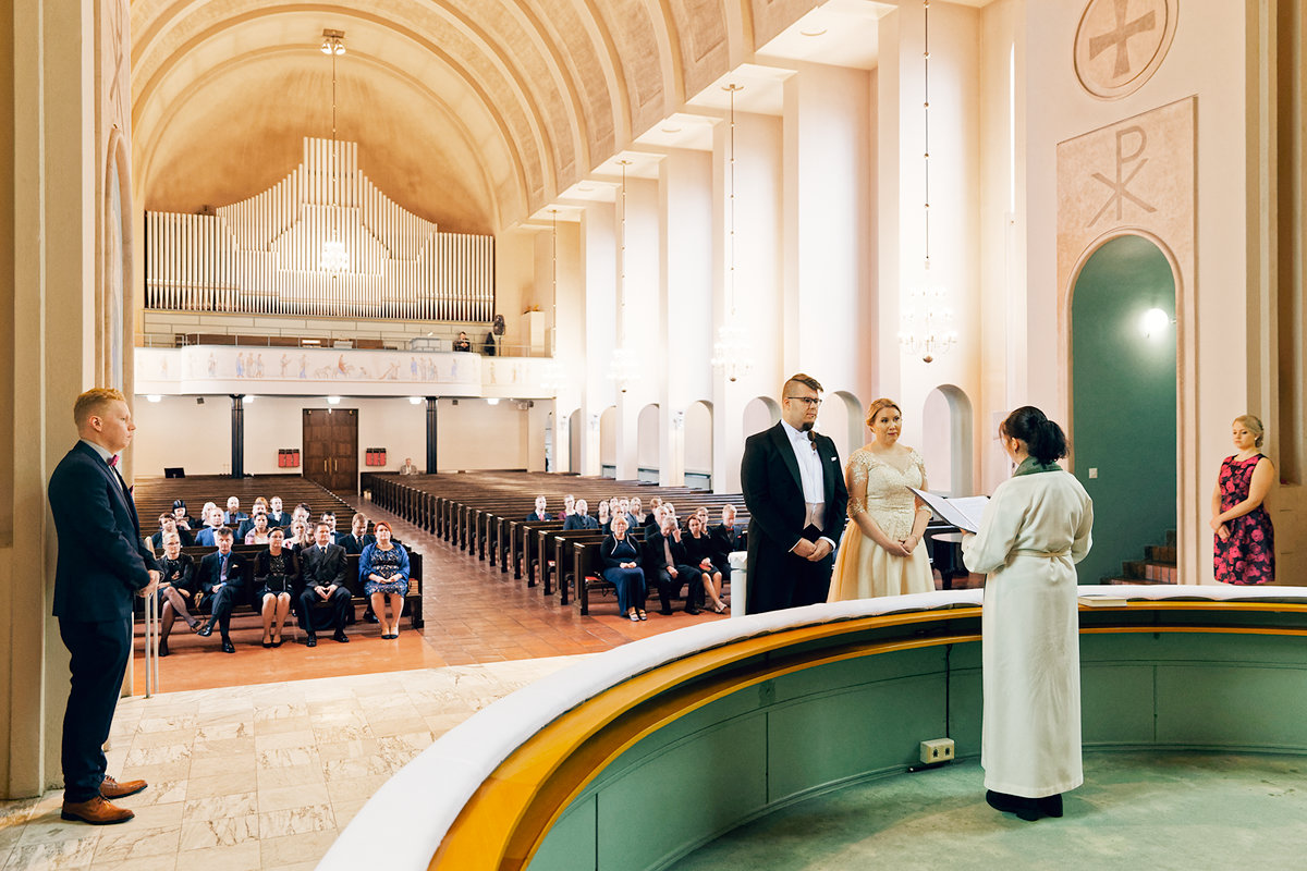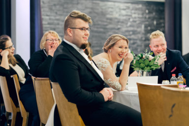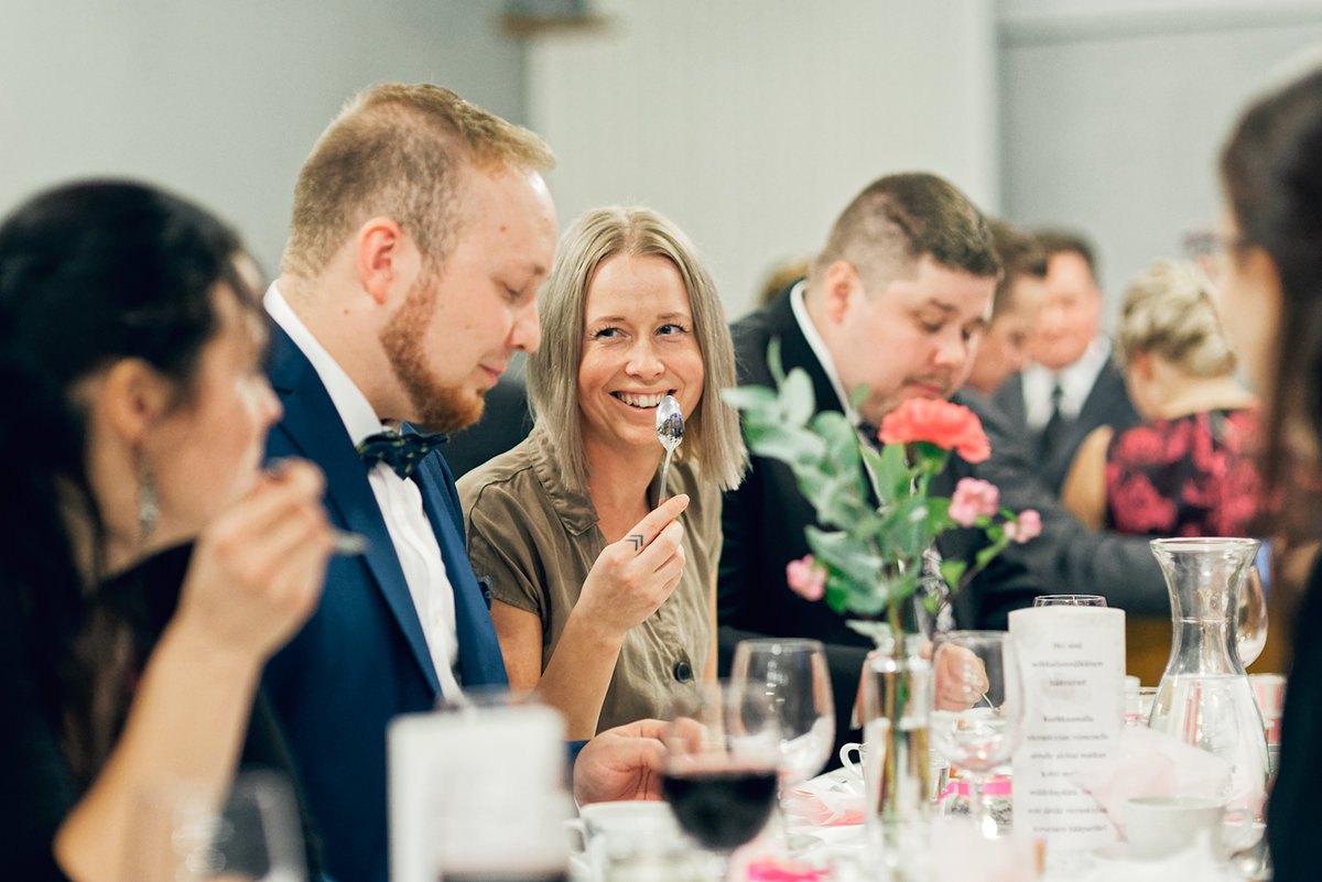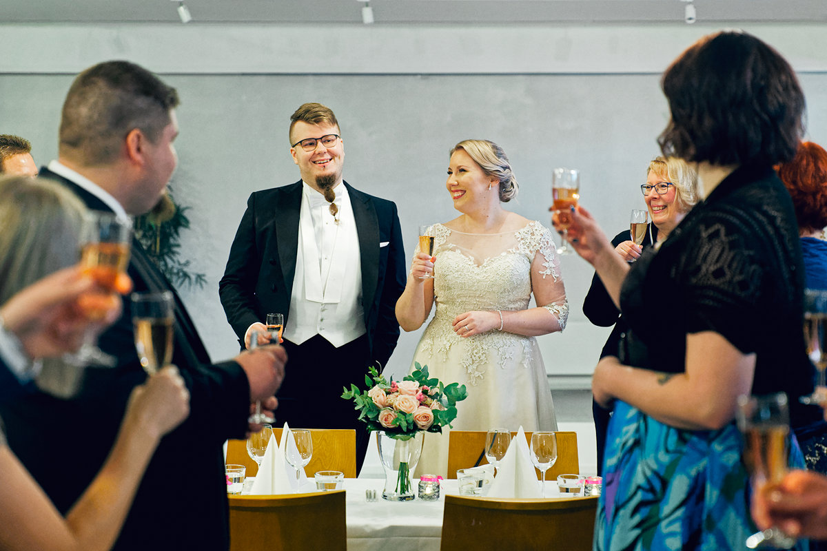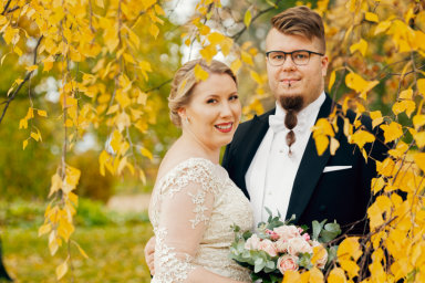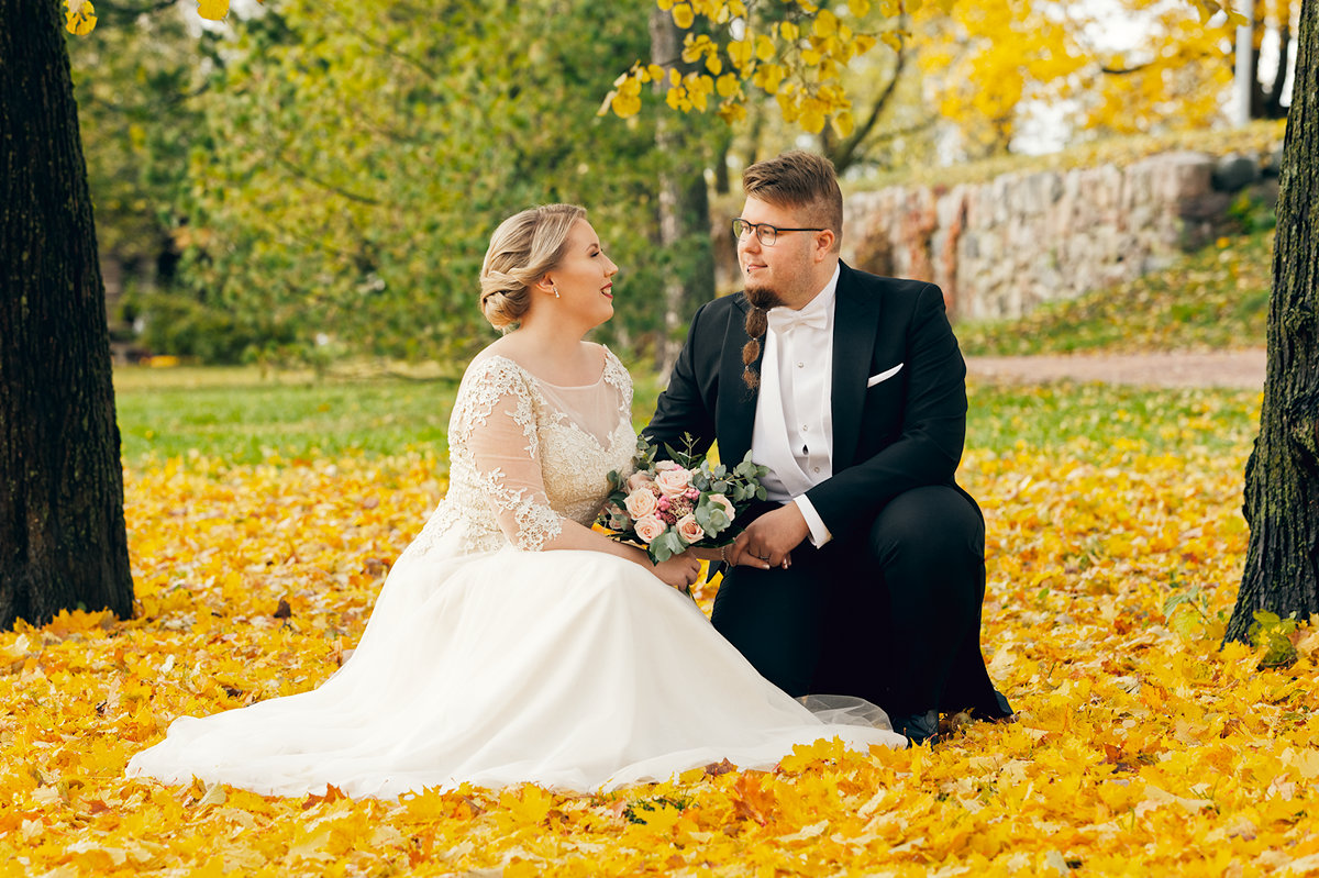 Häitä vietettiin hienona ruskaan värittämänä syyspäivänä. Häämuotokuvat otettiin kauniissa Linnanpuistossa, keltaisten lehtien värittäessä upeasti tilannetta. Puistosta jatkettiin Martin kirkkoon, joka ei ole niitä ihan suosituimpia hääkirkkoja, vaikka onkin niin upea että voisi olla. Kirkosta matka vei Juhlavaan, joka seudulla asuneena muistuu entisenä Jehovan todistajien salina. Niin vieraat kun kuvaajakin viihtyivät juhlissa hyvien tarjoilujen, puheiden ja muun mukavan kera.